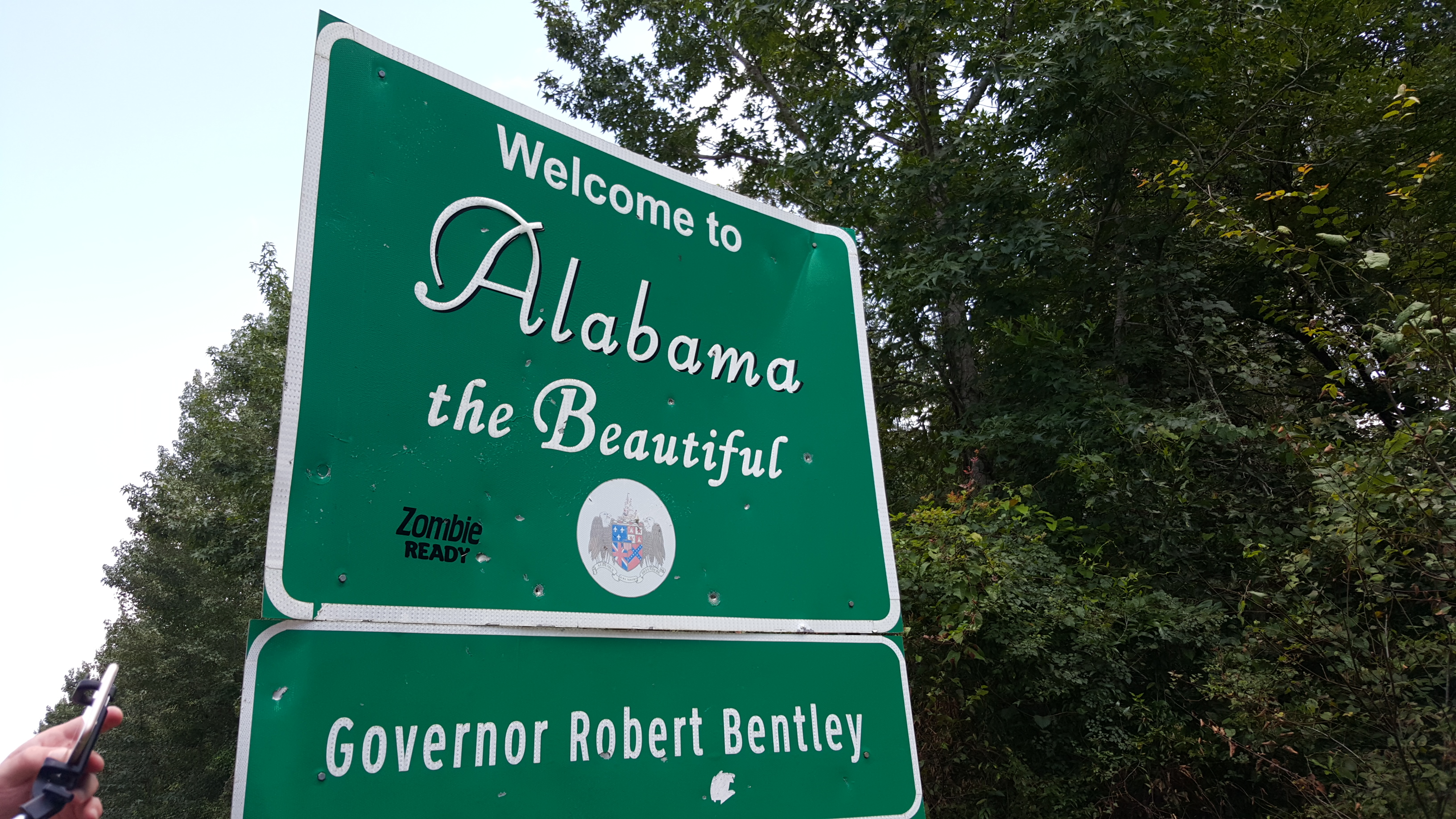 We crossed into our 30th state, Alabama. Have a look at some graffiti on the sign: