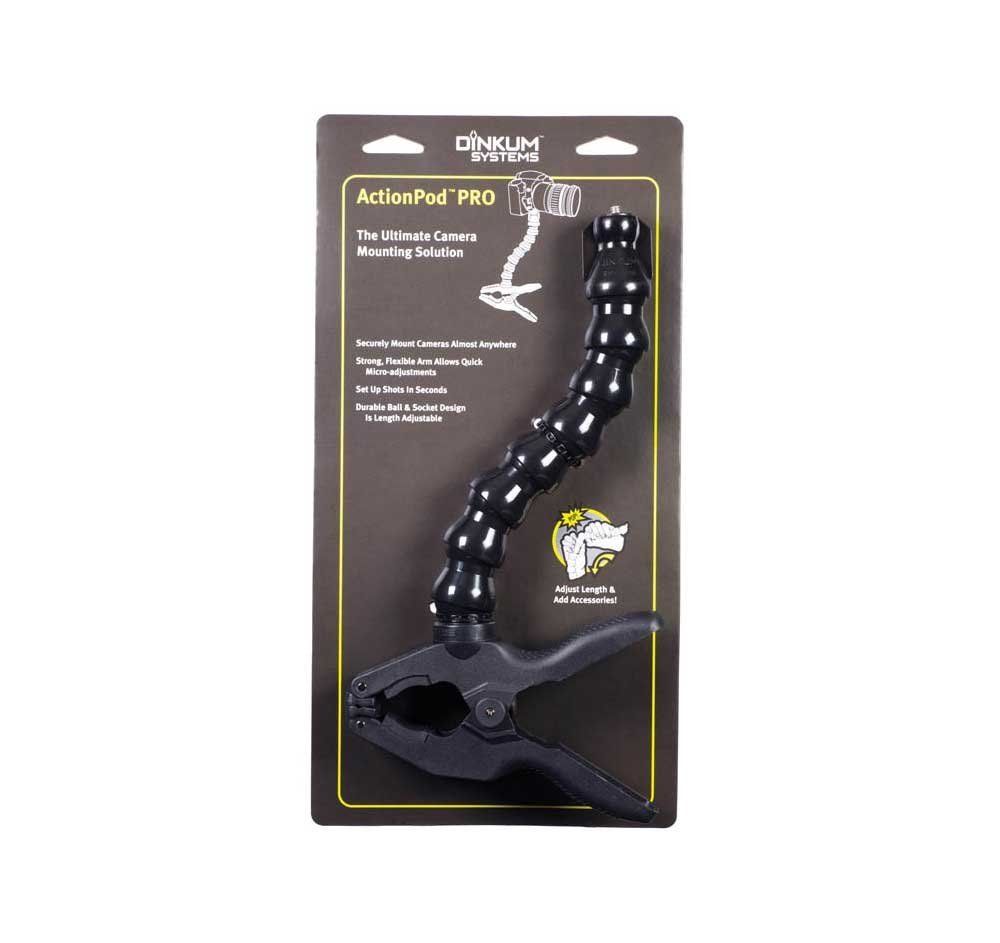 He got a Dinkum Systems ActionPod Pro, which is intended to hold a camera. Interchangeable accessories are available, one of which looked like it might be able to hold the phone, or failing that, the selfie stick, the Dinkum Systems Clamping Top, 1″ for Action Pod.
