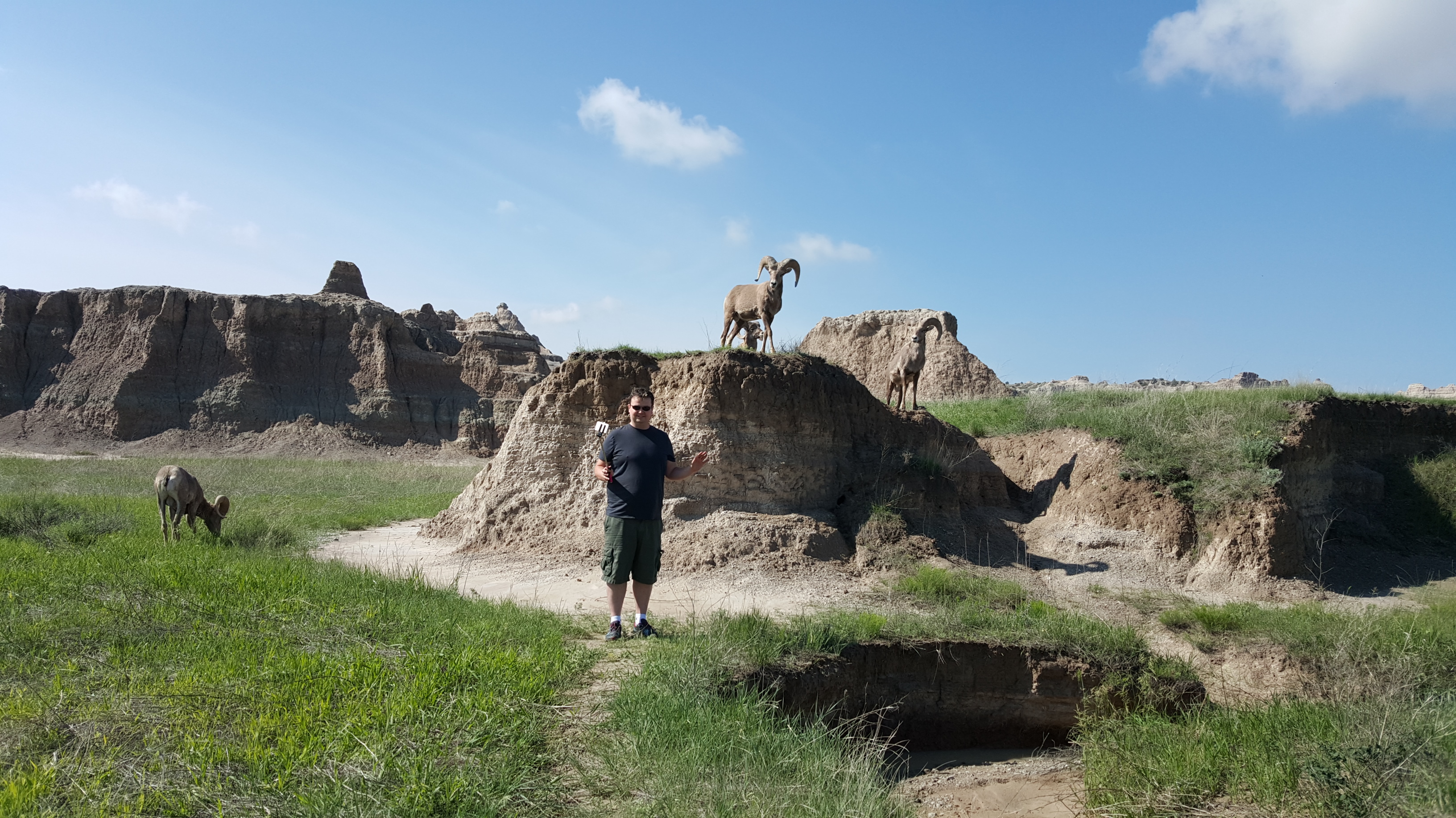We left Kadoka bright and early since we had changed time zone and getting up was easy. We headed off to Badlands National Park. From Native Americans to French fur traders, everyone has considered these lands ‘bad’. I assume what they meant is ‘corn cannot be grown on this surface’ and ‘isn’t it a pity cars haven’t been invented yet to traverse this otherwise lovely place’. In all seriousness, I am sure it was a very harrowing place to live in less than modern times, but today it is truly stunning. I had gone as a kid, but was happy to get to go back and take Chris. I don’t think he’d ever seen anything quite like it. He also got to get quite close to some rather bad ass sheep: