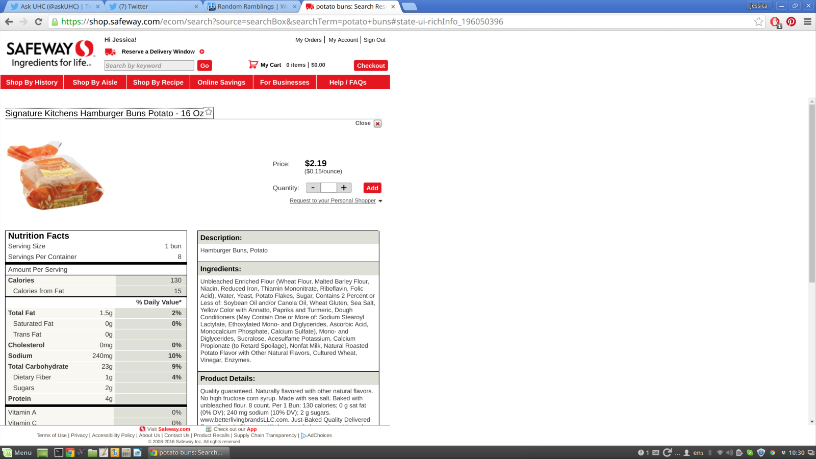 So we thought we’d done a good job of cutting out all the HFCS, as we talked about in the previous post. Unfortunately, this was not entirely true. We get grocery delivery orders from Safeway every week or two. I used their website nutritional information extensively to find products not containing HFCS. I actually specifically mentioned a brand of potato buns that claimed not to contain HFCS on Safeway’s website in the previous post. Below is a screen capture of said claim. If you have a look at the product details, it specifically says there is no HFCS and it is not listed in the ingredients:
