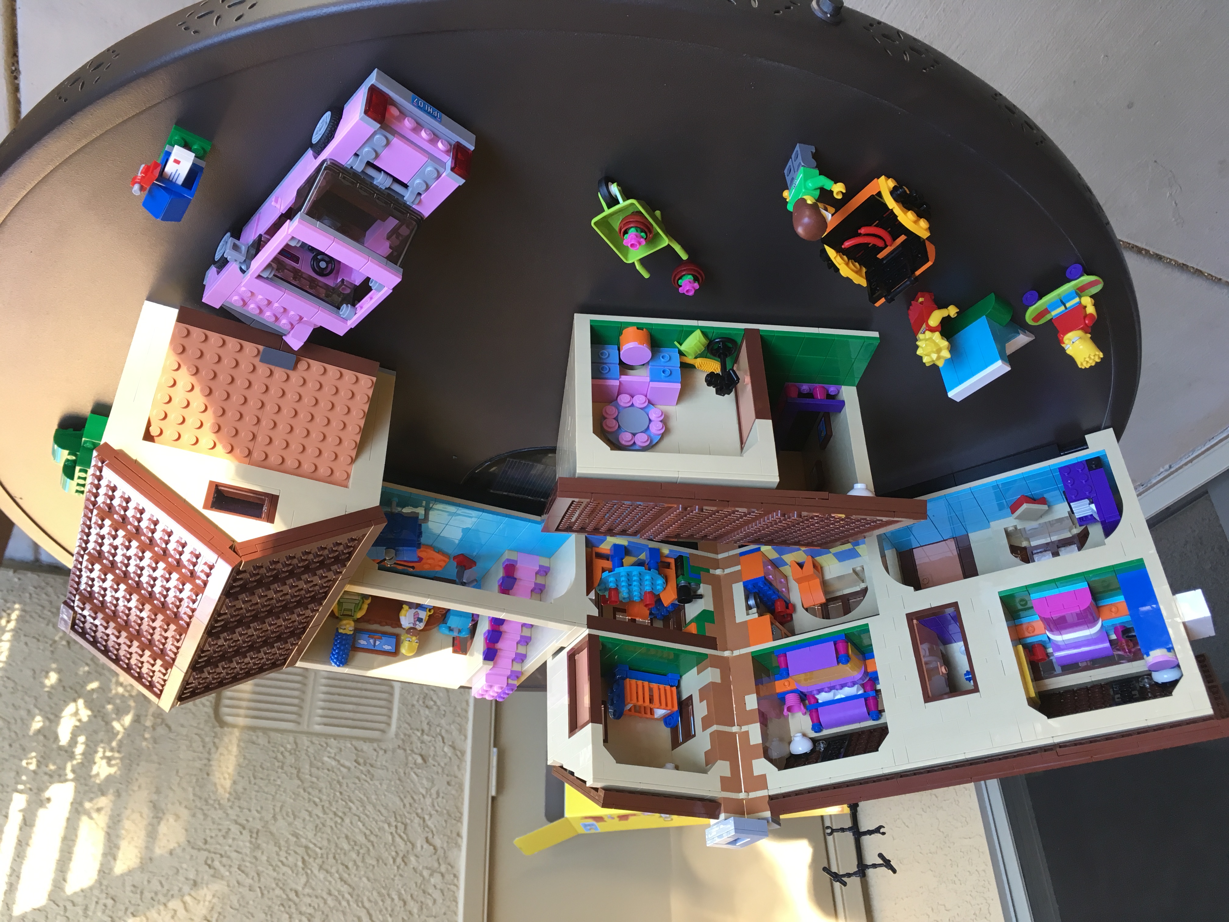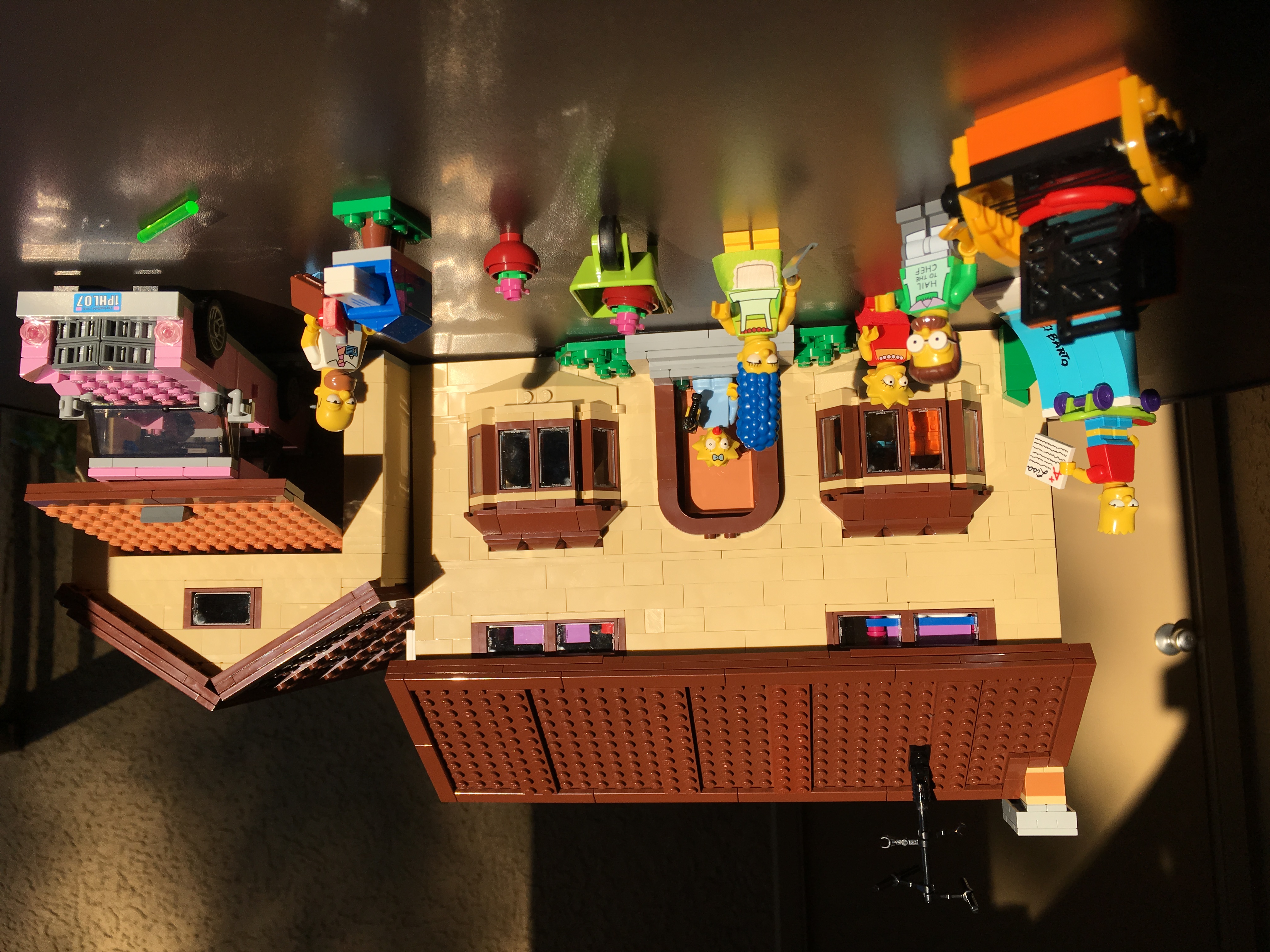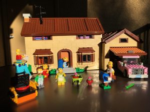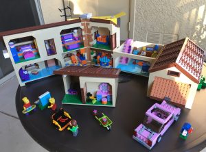 The Simpsons house has been one of our favorites. We have rewatched a fair amount of the first half of the series in the last year, so it was very fresh in both of our minds. More than that, the Simpsons’ world works very well in Lego given Lego’s primary colors are similar to those of Springfield. In addition to having minifigs of most of the whole family plus Flanders, the whole house opens up in a few different ways. Here is one of them: