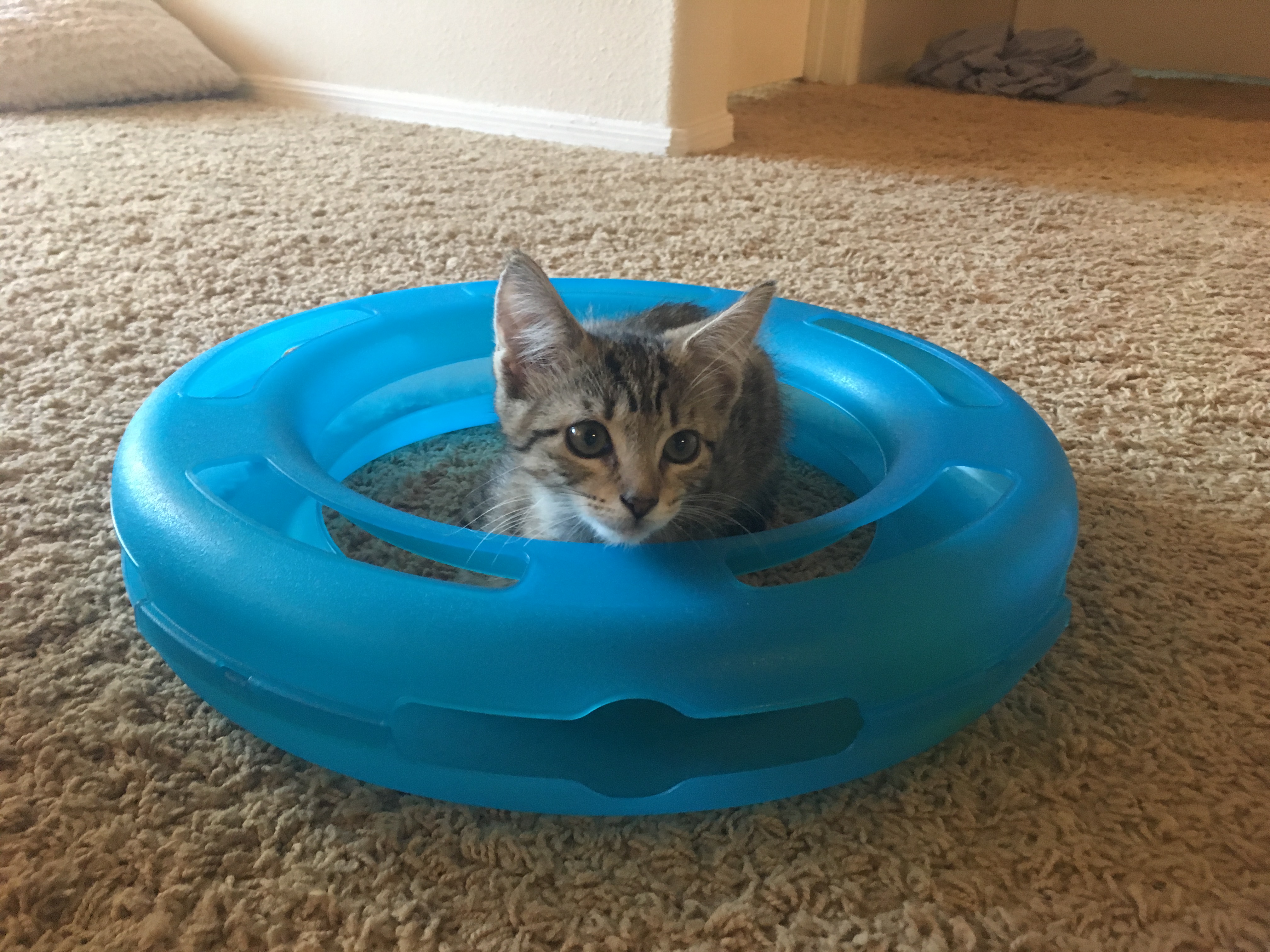They also really like the tunnel system we bought for them. This was especially important because our living room/kitchen is very open plan and the only room we plan to allow them into. Basically, they didn’t have enough hiding places and none of the normal boxes were really hidden enough, which caused them to be very interested in hiding inside of our reclining sofa. The only thing I can say against that is the ball attached came off within about 30 minutes, but we’re going to keep it since it works well as a tunnel and that was the main point. You can see that in the video: