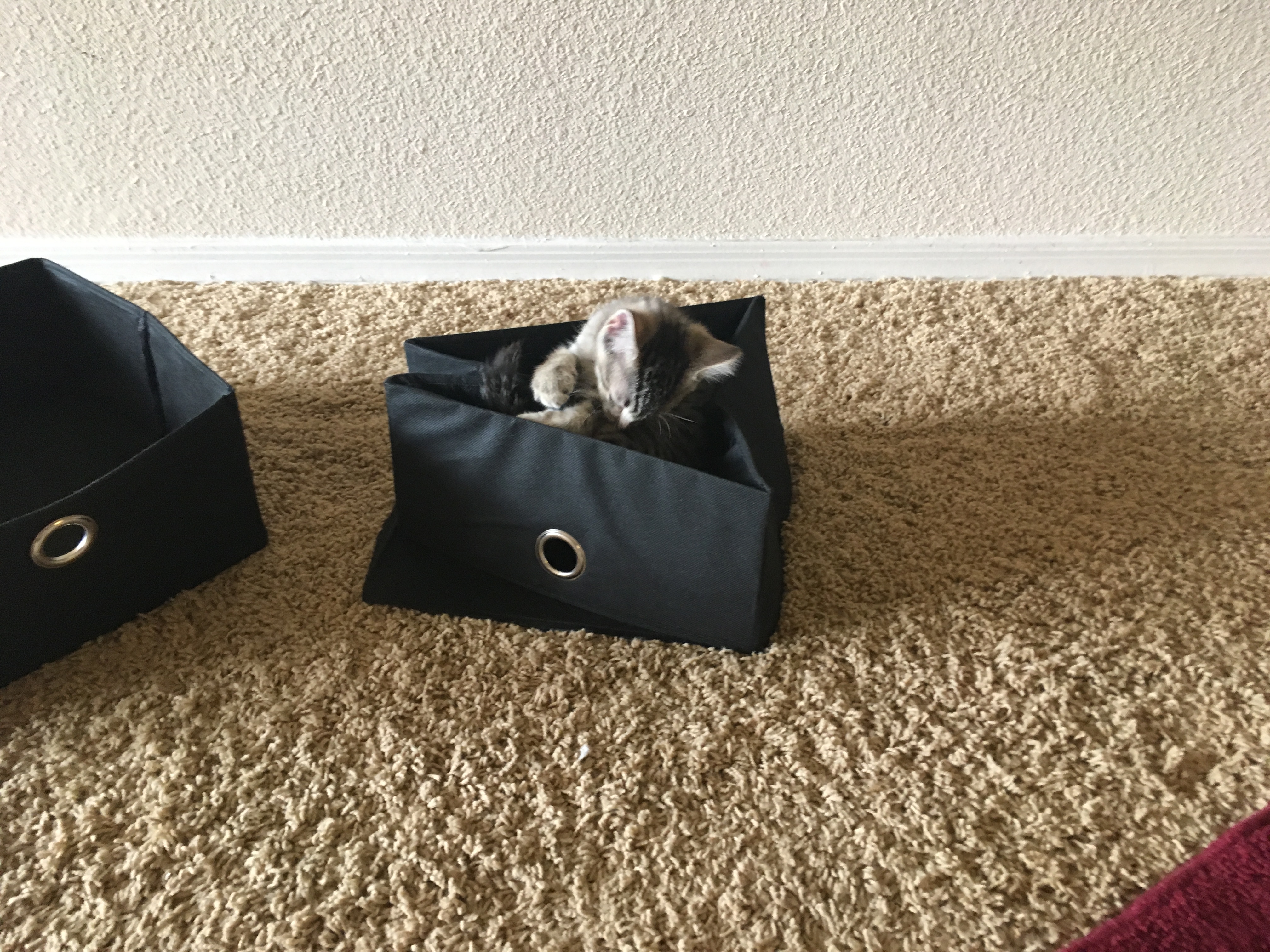 They quite like eating cardboard, so we have had to take most boxes away that are too easy to eat, but they love these ‘non-woven bins’, as Amazon calls them. They haven’t seemed as able to eat or otherwise destroy them as cardboard. They make for great toys because they can hide in them, collapse them and see through the little hole in them. They were part of some truly hideous nightstands we got when we first moved to the US that have since been replaced with proper ones.