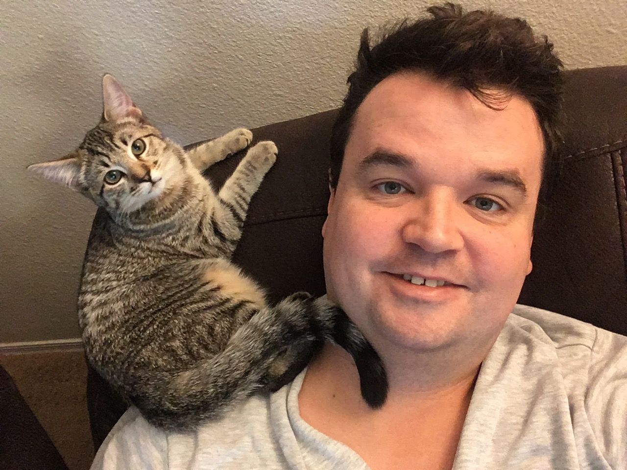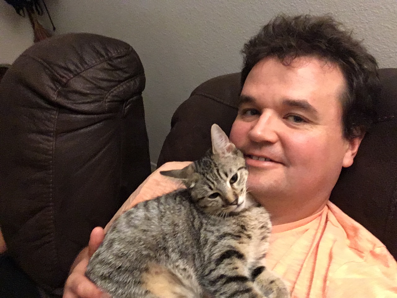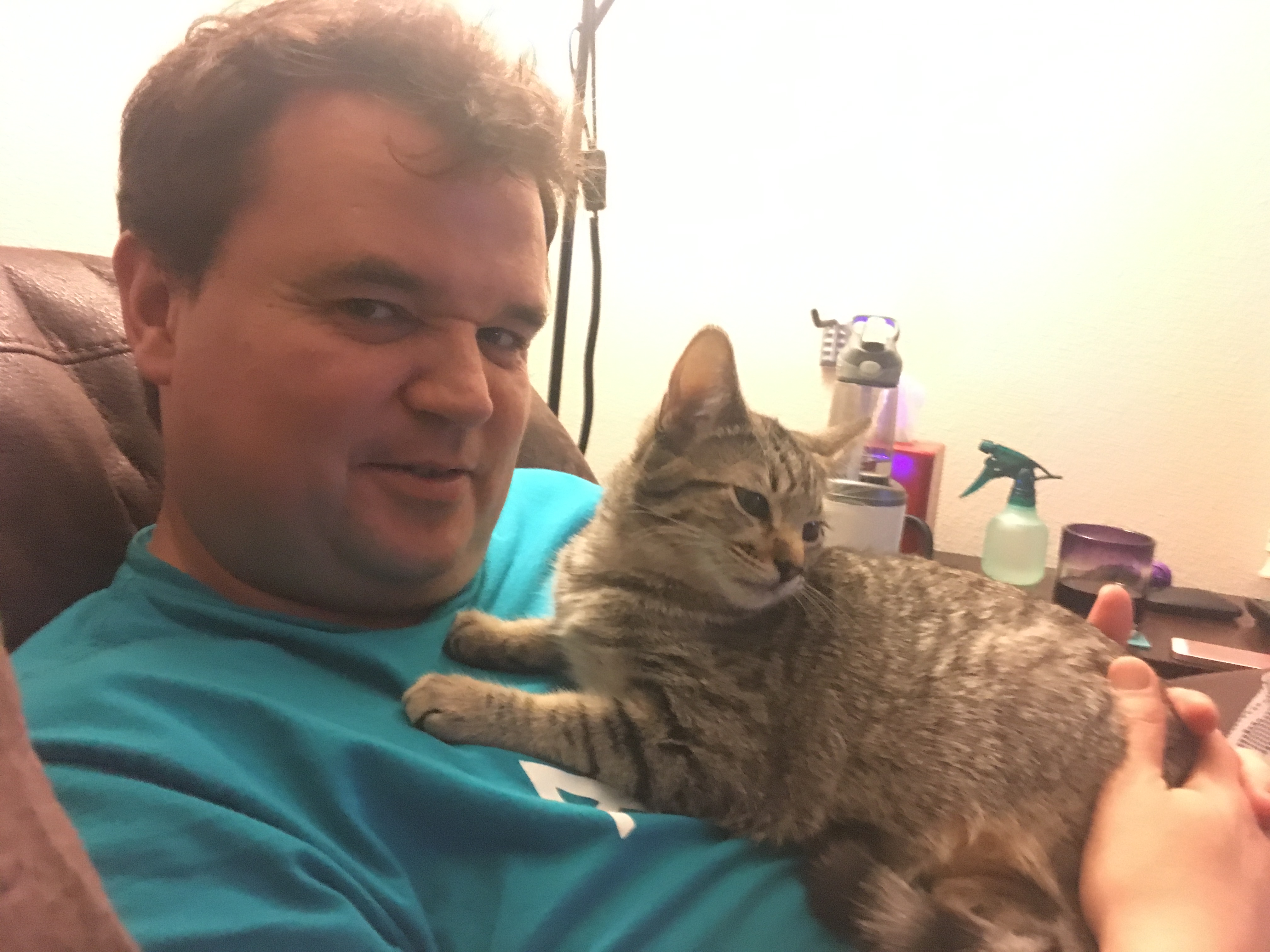 They are both about 3 times the weight they were when we got them on October 25th. Zosia, in particular, seems very strong and muscular. Kasia is strong and fast too, but a bit fluffier. Kasia is as bold as ever and still really likes to sit on Chris: