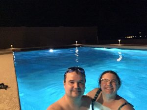 The project is not done yet and it may even be a few weeks before it’s properly finished, but the pool itself is now operational! It has water, chemicals and one of the two heaters is up and running, so it is usable! We decided to wait until it was properly warm enough before going in. Arizona may be known for heat, but most people don’t use their pools from about mid-October to March because it gets cool enough overnight to make pools less pleasant temperatures if you don’t heat them. Basically, to all our relatives and friends in cooler climes, yes, we are now wusses 🙂 We waited for it to hit 83F before we went in.
