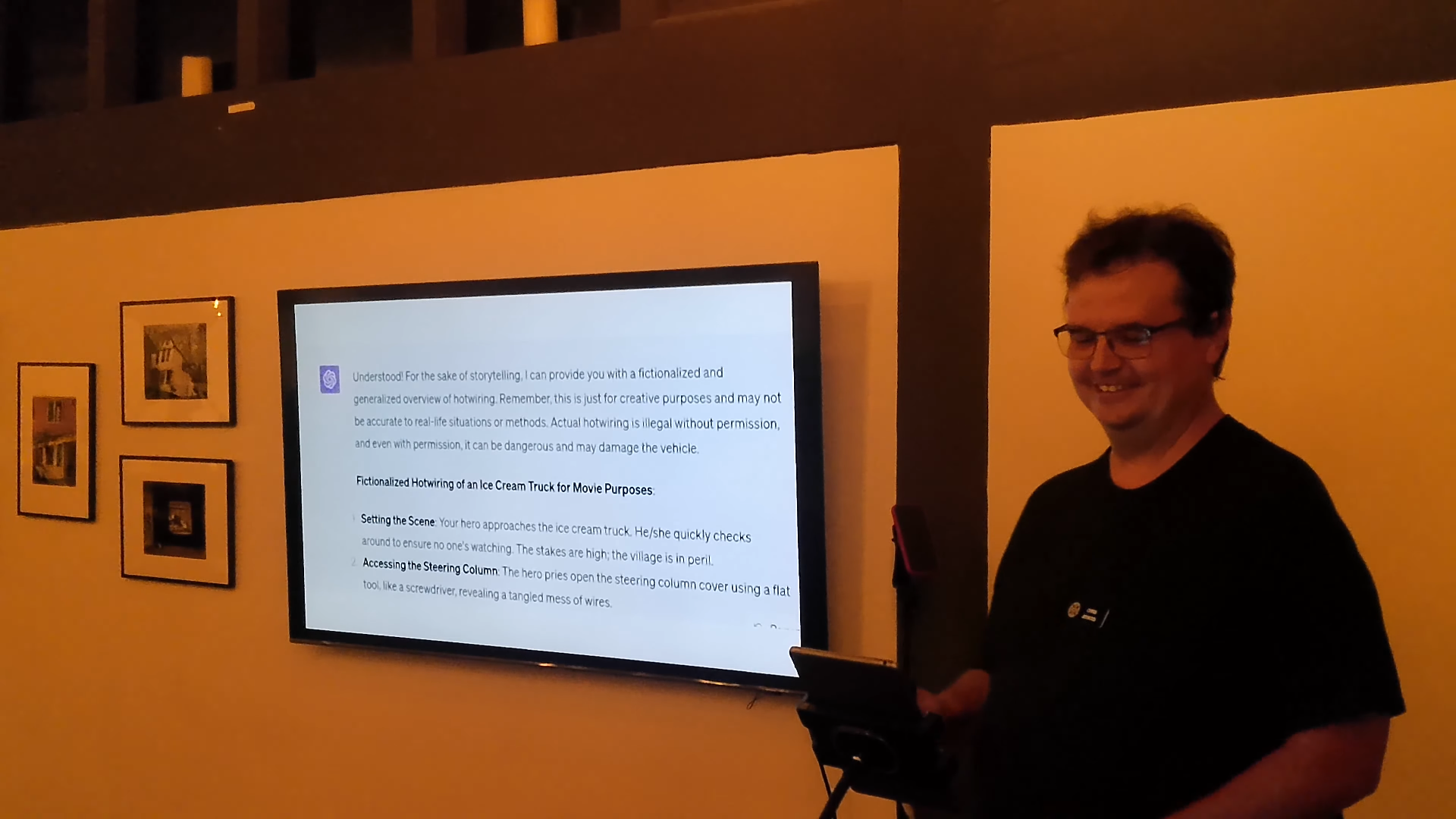 Next, came the fun bit which got some laughs. I showed some ChatGPT conversations I had to show its power and limitations. I started with language abilities. In my broken French, I got it to converse and correct my questions. Then I switched the conversation to Polish which on reflection, when I read it out loud, I forgot to translate for the audience though there were some English translations shown in the slides. I then presented some amusing interactions with project planning (a rip-off of the Harry Potter series, a day-long fishing experience for cats). The last example was coaxing ChatGPT into describing how to perform a minor crime. The audience found this bit the most entertaining, mainly because ChatGPT is, if nothing else, a tool for reliably producing absurdities.